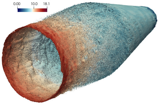 The case stems originally from ERCOFTAC (European Research Community On Flow, Turbulence and Combustion). A detailed description is available [15] and experimental data [16] as well. A diffuser is designed to reduce the flow velocity and therefore increase the fluid pressure without causing significant pressure loss; see Figure 4. This is carried out by increasing the cross-section area, e.g., by introducing a conical segment. The latter is characterized by a so-called divergence angle, which is the angle between the opposite walls in the axial cross-section through the conical part. Due to this geometry, the flow tends to separate at the diffuser wall, which is undesirable since it causes losses. However, the behavior can be counteracted by the inclusion of a swirling flow component in the flow entering the diffuser. But if the swirl is too strong, a recirculation along the center axis occurs, which reduces the pressure recovery.