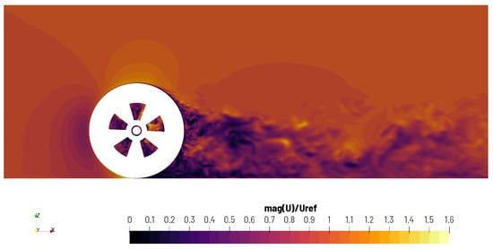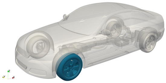 This microbenchmark aims to represent an industrial application on a small scale using the arbitrary mesh interface (i.e., ACMI) in OpenFOAM. The case consists of a single isolated rotating front left wheel of the DrivAer full-scale car model in the variant introduced by Ford [20]; see Figure 6. The CAD data were taken from case 2 of the 2nd automotive CFD prediction workshop [21] and the parts used for this microbenchmark are shown in Figure 6. The positioning of the wheel axis is inherited from the full-scale case. The domain inlet is positioned at x = −2500 mm, such that the domain lengths upstream and downstream of the wheel are approximately 3.4D and 9.7D with D being the outer tire diameter. The domain size is chosen arbitrarily but ensures adequate distance to boundaries for numerical stability and resolution of the turbulent flow downstream of the wheel. Figure 7 shows velocity contours of a snapshot after the simulation of about 10 full rotations.