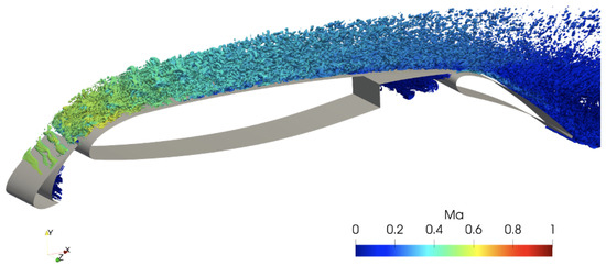 Instantaneous snapshot of iso-surfaces of the Q criterion (with Q = s−2) colored by local Mach number, showing the flow over the high-lift airfoil.