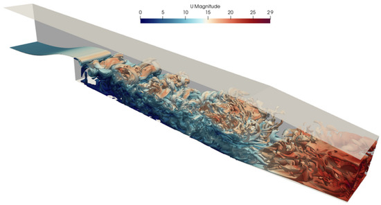 The dimensions used in the numerical setup are kept the same as in the OpenFOAM tutorial cases; however, they are in a 3D configuration. These deviate from the geometry described in the experimental setup by several mm. Furthermore, there are no dimensions of the contraction section available in the original paper [25]. It is assumed that these deviations do not introduce a significant influence on the final results. An additional geometry feature that matters is the ramp upstream of the test section. Calculations with a short straight inlet section resulted in a stable flow demonstrating no fluctuations. This is probably due to the insufficient development of the boundary layer up to the edge of the step. Thus, the inclusion of the ramp is essential for the results.