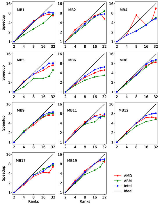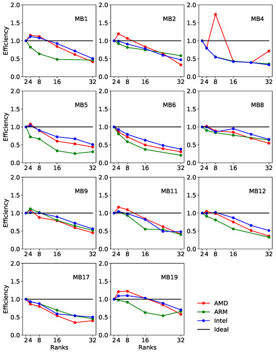 The strong scaling speedup (Figure 13) and efficiency (Figure 14) on the different node types have been calculated based on the data collected on the execution time. Several MBs show superlinear speedups on x86_64 architectures with efficiency values that exceed 1 (MBs 1, 2, 4, 5, 8, 9, 11, 12, and 19) especially when moving from two to four or eight cores. This phenomenon is more pronounced on the AMD processor. When using Arm processors, the efficiency exceeds 1 only in the case of MB9. The reason behind the superlinearity is currently being investigated. One hypothesis is that the larger L3 cache of the AMD CPU (128 MB for AMD, 22MB for Intel, and 4MB for Arm) promotes this behavior.