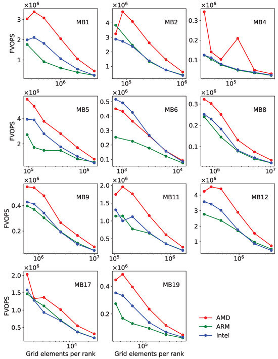 Finally, Figure 15 reports the FVOPS (finite volumes solved per second) metric [30] for the same numerical experiments. This metric is defined as the number of finite volume elements in the grid divided by the execution time of a time step or iteration. The FVOPS metric depends on all parameters of the simulation, including grid size, partitioning, parallel efficiency, type of solver, and number of variables being solved. However, with fixed parameters, this metric allows the direct comparison of the performance on different systems, even with different grid sizes. The plots in Figure 15 show in many cases local maxima which indicates the optimal number of grid points per core per MB and architecture. It is interesting to notice that these local maxima occur at different values of grid element per rank when utilizing different processor types.