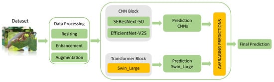 To accurately classify apple leaf diseases, we introduce a hybrid DL architecture known as “CTPlantNet”. It uses pre-processing and data augmentation techniques to achieve the highest performance of the models used in this architecture. Three models are implemented in CTPlantNet as model blocks. The first block incorporates two modified convolution-based models (SEResNext-50 and EfficientNet-V2S). The second block consists of a modified Swin-Large transformer model. These two blocks were used as CNN-transformer backbones to extract the features of apple foliar diseases. After training the models separately, an averaging technique was used to combine their predictions. Additionally, training and validating the performance of these models involved a 5-fold cross-validation strategy coupled with a bagging technique. As a result, a diverse range of models, each trained on different sub-datasets, was generated (five SEResNext-50 models, five EfficientNet-V2S models, and five Swin-Large models). The proposed architecture, named CTPlantNet, is illustrated in Figure 2.