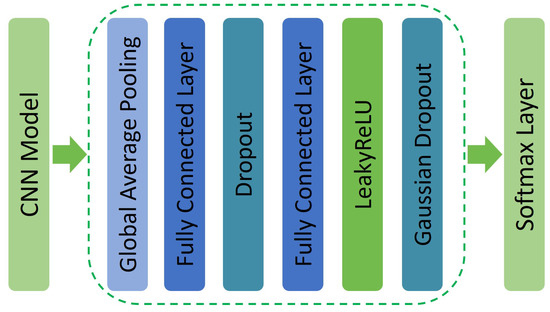 The implementation of the proposed approach includes incorporating three separate pre-trained models, where two, specifically SEResNext-50 and EfficientNet-V2S, are CNN-based and were pre-trained using the ImageNet dataset [34]. The third model (Swin-Large) was pre-trained on ImageNet22k [33]. To enhance the performance of both CNN models, we added a set of layers, starting with a global average pooling (GAP) layer. The layer computes the average of patch values in each feature map, producing a vector that was then fed into two fully connected layers (FCLs) with dimensions of 512 and 256. A 30% Dropout (DP) layer was incorporated following the first FCL to mitigate the risk of overfitting. Additionally, to address the ReLU dying problem [35], we employed a LeakyReLU (LRU) activation function after the second FCL. To improve the accuracy and performance of our models while reducing the training time, we integrated Gaussian Dropout (GD) at a rate of 40% [36]. More details about the added layers are depicted in Figure 5. The Swin-Large model in our architecture was fine-tuned by incorporating an FCL and a softmax activation function.