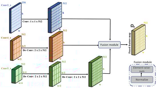 To capture multi-scale features, we make modifications to the original VGG-16 architecture. We utilize the three convolutional layers of the VGG-16, namely, conv3_x, conv4_x, and conv5_x. The overall mechanism of extracting multi-scale features is illustrated in Figure 2. As is obvious from Figure 2, the sizes of the feature maps of these three layers are not same. The size of the feature map of the conv5_x layer is half the size of that of conv4_x. Similarly, the feature map of conv4_x is half the size of the feature map of conv3_x. It is to be noted that convolutional layer conv3_x contains information about the small objects, conv4_x contains information about the medium objects, while conv5_x contains information about the large objects. To combine the feature maps of these three layers, it is important to re-size the feature maps of these layers to make them suitable for the fusion process. In order to do this, we employ one deconvolution operation (of size 2 × 2) on to upscale the size of the feature map equal to the size of . Similarly, we employ two deconvolution operations on (each of size 2 × 2) to upscale the size of the feature map equal to the size of . After aligning the feature maps to the same size, we first normalize the feature maps and employ element-wise addition to fuse the feature maps from the three layers. Let be the final fused feature map. The feature map now contains multi-scale information, providing valuable assistance in boosting the classification accuracy. The detailed architecture of the global stream model is provided in Table 1.
