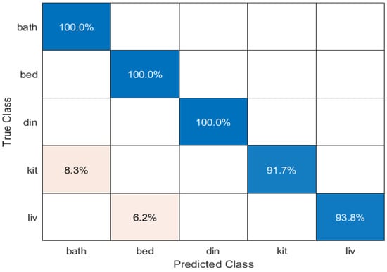 To evaluate the effectiveness of the proposed framework, we report the performance in terms of a confusion matrix, as illustrated in Figure 7. Figure 7 represents the performance of the proposed framework in predicting the five different classes (Bathroom, Bedroom, Dining room, Kitchen, and Living room). From the Figure 7, it is observed that the proposed framework achieves 100% accuracy in predicting the Bathroom, Bedroom, and Dining room classes. However, we observe that the proposed framework faces challenges in precisely predicting the Kitchen class; it is clear from the confusion matrix that the framework misclassifies 8.3% of instances of the Kitchen class as the Bathroom class. This is because both the classes share similar features or characteristics. A similar case was observed in the Living room class, where the model misclassifies 6.2% of instances of the Living room class as Bedroom.