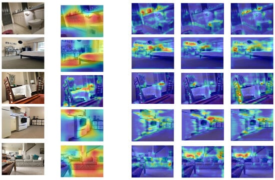 Figure 4 depicts the heatmaps obtained from the different scales. Initially, the input image was resized to a scale of 56 × 56 before being inputted into the local stream. The resulting feature map was then resized to match the size of the input image. Similarly, heatmaps were generated for scales of 112 × 112 and 224 × 224. From the Figure 4, it is evident that the local stream model focuses on localized regions, as indicated by bounding boxes highlighted in red. It is worth mentioning that while the global stream model prioritizes capturing information about large objects and global context, the local stream model aims to capture details of smaller objects. For instance, in Figure 4, the local stream effectively detects various local objects, such as tap water, bottles, and toothbrushes, etc. This localized information is crucial for scene recognition, as these objects are typically found in settings like bathrooms rather than in other areas like living rooms.