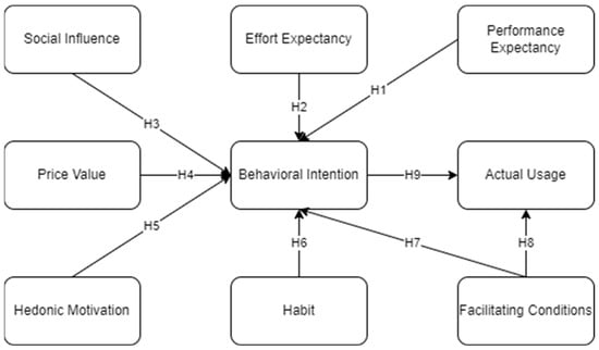 According to the studies of Venkatesh et al. [] and Kim et al., [], habit as a behavior significantly influences an individual’s intention and actual usage, in this study, of Netflix in the Philippines. Habit, within the realm of consumer behavior, is characterized by the extent to which individuals engage in certain behaviors automatically and unconsciously due to their previous experiences []. It signifies a repetitive process driven by ingrained, unconscious behaviors. In the context of Netflix, subscribers often exhibit habitual behaviors such as binge-watching entire series or revisiting their favorite films during their leisure time. These behaviors can be viewed as routines that individuals have established in their entertainment consumption patterns. In essence, individuals may form habitual behaviors related to specific types of content or viewing habits, further emphasizing the complex interplay of habit formation and evolution. According to Venkatesh et al. [], there is a favorable association between intention and actual utilization of technology. This suggests that a person’s purpose in using Netflix can influence their actual usage of the service. Consequently, the following hypothesis has been formulated: