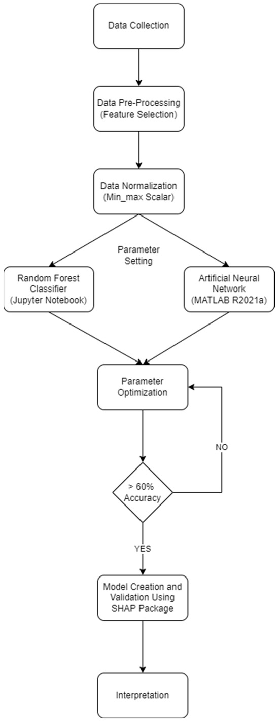 For the Python software, the sklearn package was employed, considering sklearn model selection, tree, decisiontreeclassifier, train_test_split, and metrics. Accordingly, the sklearn.ensemble with randomforestclassifier import was considered alongside sklearndataset and make_classification packages and libraries. Lastly, the classification_report and confusion_matrix were employed for training and testing output reports. For the MALTAB program, the machine learning package was employed, utilizing the neural network fit with the Levenberg-Marquart Algorithm, Bayesian Regularization, and Scaled Conjugated Gradient. The iterative process using the package was considered while finetuning the different parameters.