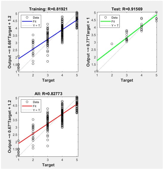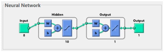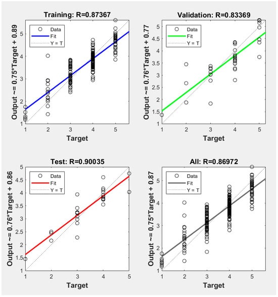 The Levenberg–Marquardt algorithm produced the best r-squared value and lowest RMSE during the optimization process, with values of 0.87367 for training, 0.83369 for validation, 0.90035 for testing, and 0.86972 overall. Bayesian Regularization, on the other hand, has RMSEs of 0.81921 for training, 0.91569 for testing, and 0.82773 overall. Finally, the RMSE for Scaled Conjugate Gradient was 0.81919 for training, 0.87504 for validation, 0.70913 for testing, and 0.82017 overall. Therefore, continuous optimization among the different hidden node numbers showed the best r-squared output of 0.86972 overall and 0.90035 for the test at 10 with the Levenberg–Marquardt algorithm. This was considered the optimum ANN model as presented in Figure 4. Moreover, the output of the different algorithms is presented in Figure 5 (Levenberg–Marquardt), Figure 6 (Bayesian Regularization), and Figure 7 (Scaled Conjugate Gradient).