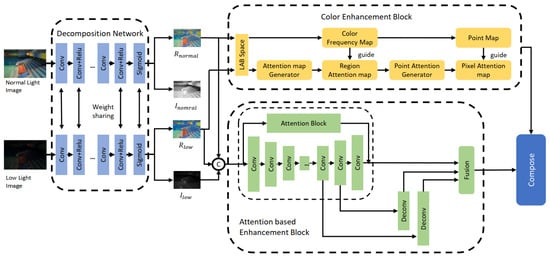 In recent years, deep learning [] has been established to be a very powerful tool for feature extraction, and it has been widely used in multiple research areas, such as image classification [,,,], object detection [,,,,], image segmentation [,,,], etc. By optimizing the feature extractor and classifier in an end-to-end fashion, deep learning models can automatically extract high-level feature representations and achieve the global optimum during the training process. Deep learning has also been applied to the area of image enhancement, especially for low-light image enhancement tasks. Researchers also proposed RetinexNet [], which combined Retinex theory with deep learning technology, and further proposed multiple low-light image enhancement methods. The general process of Retinex-theory-based methods is to extract the illumination component and reflection component through a decomposition model first, and then enhancement is applied to the reflection component, and the enhanced reflection component and illumination are composed again to generate the final enhanced image.