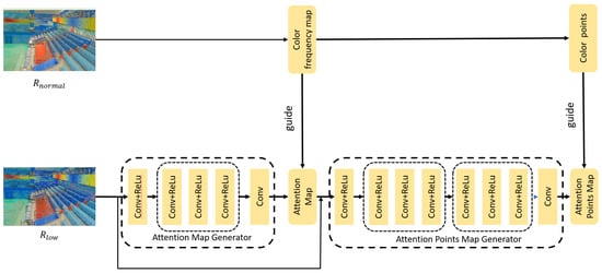 So, in this paper, the AB channel is considered as the input of the color enhancement block (CEB). The AB channel first goes through the attention map generator and generates a two-channel attention map corresponding to the AB channel. The generated attention map is concated with the AB channel, and the concated feature further goes through the attention point generator to generate an attention point map . The generated attention map and attention point map are used to help the proposed network maintain the color distribution of the input image and extract more realistic color representations. The generated attention map and attention point map were supervised by the color distribution map M and P, which were generated from the reflection component of the normal-light image, as the images captured under normal-light conditions contain more realistic and precious color information. For a given image, the color distribution map M was calculated by counting the color appearance for each pixel. The color distribution map M is calculated as