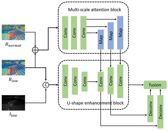 The structure of the proposed ATEB is shown in Figure 3. The input image is first decomposed into the illumination component and reflection component by the decomposition subnetwork, and the enhancement process is then applied to the reflection component. The proposed ATEB contains three parts: (a) the multiscale attention block, which used to help network focus on the multiscale region of interest of input image by extracting multiscale attention maps; (b) a U-shaped enhancement block, where a U-shape network structure is constructed to extract multiscale feature presentations; and (c) a multiscale feature fusion strategy, where the multiscale attention map and multiscale feature representations are fused to generate feature representations with sufficient local region texture information.