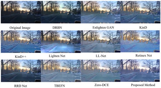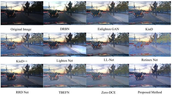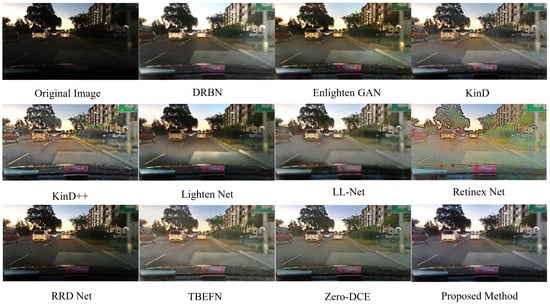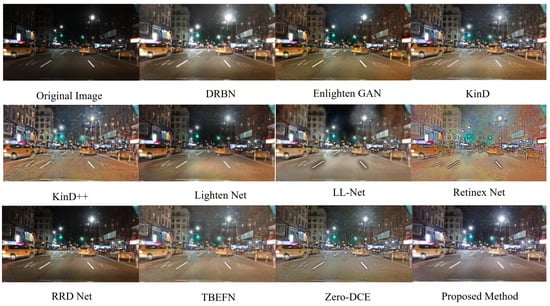To further evaluate the effectiveness and genetic ability of the proposed method, the proposed DCTE-LLIE method is also applied to the MIT-Adobe FiveK dataset, and its performance is also compared with multiple existing enhancement methods. The experimental results are shown in Table 3. One can also find that the proposed DCTE-LLIE method can still achieve satisfactory enhancement performance, and the performance of the DCTE-LLIE method on PSNR and SSIM is only a little bit worse than that of LLFlow [], while it is better than other deep-learning-based enhancement methods. This means that the proposed DCTE-LLIE method can still achieve outstanding performance on different enhancement tasks, and the general ability of the proposed method can be promised.