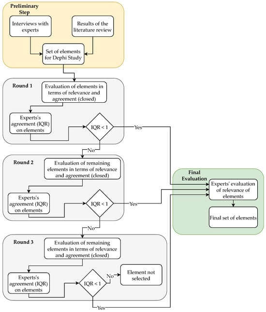 The questionnaire was distributed to the participants via an Internet-based survey platform. Limesurvey was determined to meet the study’s goals and objectives. The inter-quartile range (IQR) approach was used based on a five-point Likert scale to ascertain consensus among the panel of experts [43]. In general, consensus on a particular element is considered reached when the IQR of the replies is equal to or less than 1, given the number of experts included in the Delphi study [44,45,46]. However, in order to be more cautious, given the novelty of the topic, this study adopted a mixed methodology that slightly differs in the development of the consensus at the early stage of the study. In order to enhance strictness and to allow for the experts to provide more insights on a new and little-studied topic, in the first round of the Delphi study, a consensus was considered to have been reached only if the IQR of a proposition is strictly less than 1.