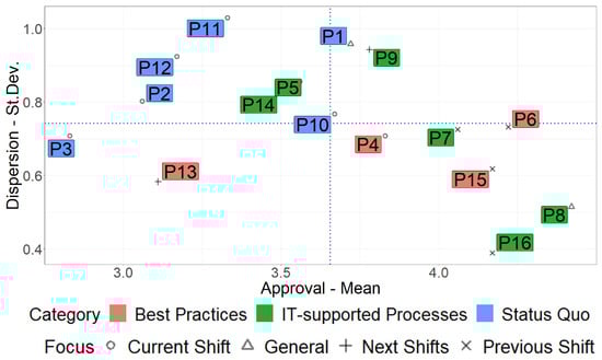 The results from Table 3 are further visualised in Figure 2 for easier interpretation. Both the category and the focus, as indicated in Table 2, are used as categorical dimensions. They are described in the legend, while the approval score is plotted on the x-axis and the dispersion measured by the standard deviation is plotted on the y-axis. The blue dotted lines indicate the average dispersion and average approval, respectively.