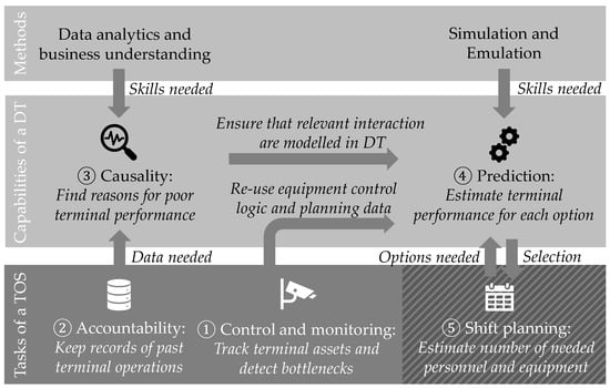 The key insights are further summarized in Figure 3. As a precondition of the DT, all processes at the terminal need to be properly monitored by the TOS (Step 1). In Step 2, the terminal operator ensures accountability by recording the monitored activities and store all process-related data, which is typically a functionality of the TOS as well. Once terminal performance is below an acceptable level, the records enable the people to investigate the issue by analysing past data in retrospect (Step 3). The required functionality might only partially covered by the TOS itself, and might require additional technical skills or software solutions. The issues which resulted in poor terminal performance need to be properly understood to avoid them in the future if somehow feasible. The DT bears most additional value when the simulation model of the DT properly represents the processes and is capable of predicting a poor terminal performance in such critical situations (Step 4). In addition, the DT needs to re-use the equipment control logic and available planning data (e.g., vessel arrival/departure information, stowage plans, etc.) of the TOS. Only when the simulated behaviour is well-aligned with the actual behaviour of the TOS, the ad hoc simulation studies provide insightful results. To avoid a complete re-implementation of the behaviour, using the TOS inside an emulation environment is preferred. One of the challenges in operational decision-making is, as identified by this Delphi study, proper shift planning, which is typically not yet covered to the full satisfaction of users by existing TOS implementations (Step 5). Generally speaking, other operational decisions can also be evaluated in the same way, such as new TOS configurations that re-balance terminal objectives or changes in terminal processes.