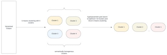 More specifically, we first convert each entry in the corpus into an embedding vector. We then segment the corpus into semantically homogeneous groups using k-means clustering. Because the initial number of clusters is difficult to set, we run clustering with an arbitrary value of 4 clusters. Then, we conduct hyperparameter tuning through grid search to optimize the number of semantically homogeneous clusters. Then, k-means clustering is undertaken again. Figure 1 below shows this process: