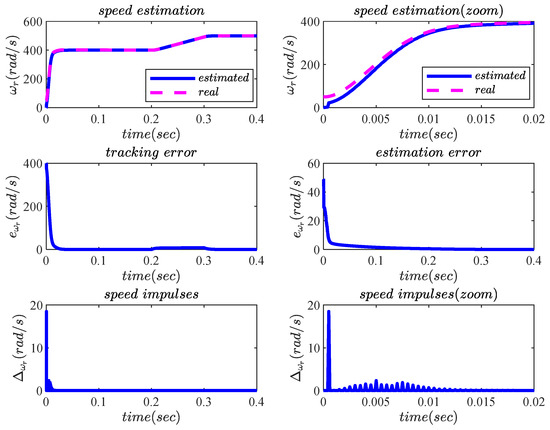 The results were simulated by MATLAB 2023b software with an ASUS laptop (Ausu Laptop Model: K556CPU COREi7/7500u, RAM DDR4, Graphic GFORCE 940MX). These results are displayed in Figure 2 for the speed tracking error, the speed estimation error, and the estimated speed jumps (speed impulses). The figures on the top row are the tracking performance and its zoomed-in version. It is very clear that the reference speed was successfully tracked after only the first 0.02 s. The figures in the second row demonstrate the tracking errors, which are very small after convergence happens. According to the results, it is clear that the proposed observer can estimate the motor speed very well. The proposed controller also tracks reference paths with appropriate accuracy. At first, it is seen that, despite the error between the actual and estimated values, these jumps have a greater amplitude, which gradually decreases.