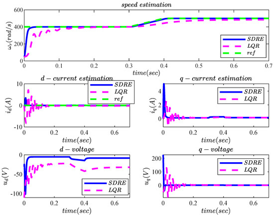 The following figures show the outputs and states of the SDRE and LQR controllers. Both controllers assume that all states are available, and they track both paths optimally. Figure 8 displays the speed estimation, currents (d-axis and q-axis), and voltages (d-axis and q-axis). It is clear that the SDRE controller performs much better than the LQR, especially when changing the equilibrium point. Because the LQR controller is linearised around the equilibrium point, by changing the equilibrium point, the linearisation accuracy is significantly reduced. Furthermore, Table 3 shows a numerical comparison between the proposed method and the LQR. The numerical results verified the efficiency of the proposed framework compared to the LQR technique in varying the reference speed.
