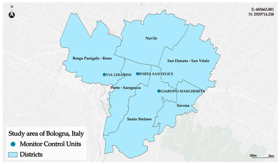Framing of the study area and location of the three Monitor Control Units in Bologna, Italy.