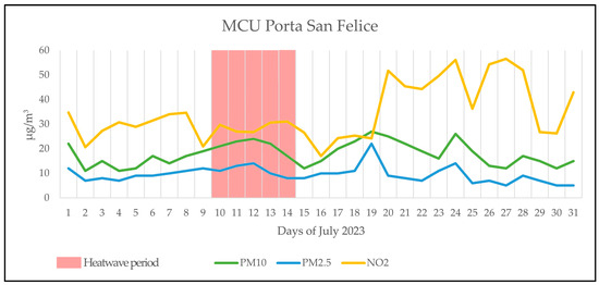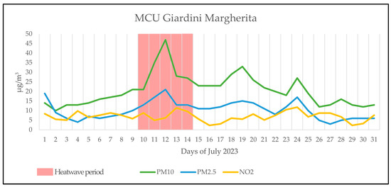 The graphs in Figure 4 and Figure 5 show, respectively, the daily trends of the PM2.5, PM10, and NO2 parameters measured in the month of July 2023 from the MCUs Giardini Margherita and Porta San Felice. Figure 6 shows the trend of PM10 and NO2 measured in the month of July 2023 from the MCUs Via Chiarini. The period in which the heatwave was detected is highlighted in red.