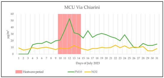 Via Chiarini MCU—daily trends of PM10 and NO2.