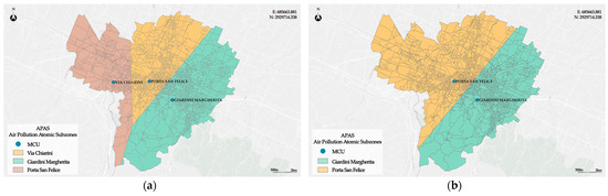 To obtain the criticality maps of PM10 and NO2, Thiessen polygons determined concerning three points made up of three MCUs are generated. Instead, to obtain the criticality maps of PM2.5, it was necessary to regenerate Thiessen polygons, considering only two points corresponding to the two MCUs of Giardini Margherita and Porta San Felice. The APASs are obtained in the two cases as spatial intersections of the census zones with the Thiessen polygons. The map in Figure 7a shows the APASs built to obtain the criticality maps of PM10 and NO2, while the map in Figure 7b shows the APASs built to obtain the criticality map of PM2.5.