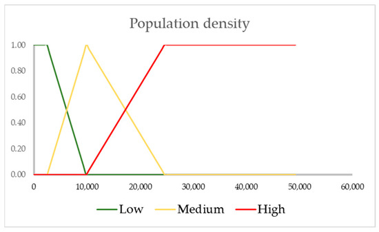To classify the density of residents living in the APAS, a fuzzy partition was created consisting of three fuzzy sets, labeled Low, Medium, and High. This classification considers a range from the minimum to the maximum population density values in the census areas. The minimum value is 0, representing census areas without inhabitants, and the maximum value is 49,254 inhabitants per square kilometer.