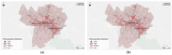 (a) Population density of the APASs generated to evaluate the spatial distribution of PM10 and NO2; (b) population density of the APASs generated to evaluate the spatial distribution of PM2.5.