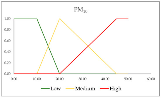 The fuzzification process is started by building a fuzzy partition into three fuzzy sets of PM10, where the fuzzy sets are given, respectively, by an R-function, a triangular, and an L-function fuzzy number. It was created with the help of a domain expert, taking into consideration the recommended maximum values indicated in the WHO AQGs.