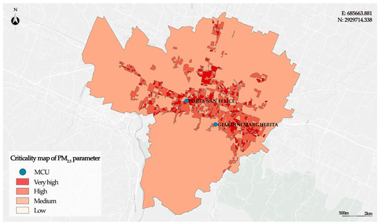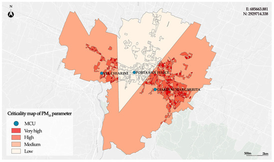 Only the areas included in the Thiessen polygon associated with the Porta San Felice MCU are not hotspots and are classified as having a Low criticality level. The areas to the south of the city, where the population density is Low, are classified as having a Medium criticality level, as in these areas the concentration of PM10 is High. The other areas, located mainly in the central area of the city, are hotspots classified as having a High criticality level, where the population density is Medium, and as having a Very High level, where the population density is High. These represent the most critical areas in which interventions to protect the population are a priority.