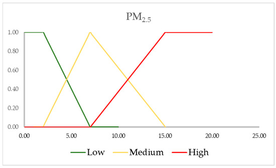 The PM2.5 pollutant is measured only by the two MCUs Porta San Felice and Giardini Margherita. The fuzzy partition of the parameter is given by the three fuzzy sets Low, Medium, and High, shown in Figure 14, considering the maximum values indicated in the WHO AQGs.