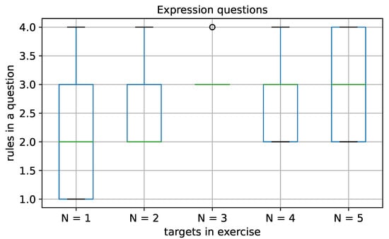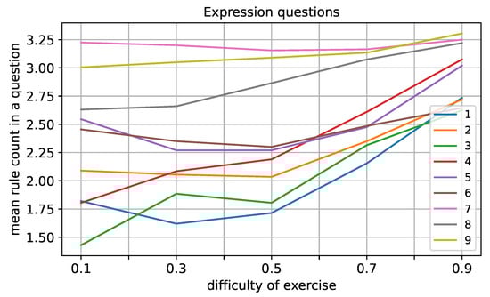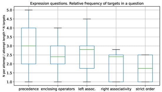 The following exercises were generated to learn solving the question evaluation order problem with the following target rules: operator precedence, binary left-associative operators, binary right-associative operators, and enclosing operators. The question bank contained questions for those rules with normalized difficulties from  to .
