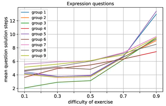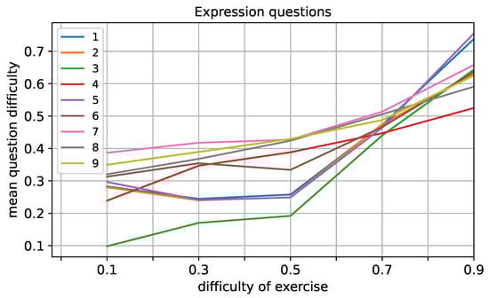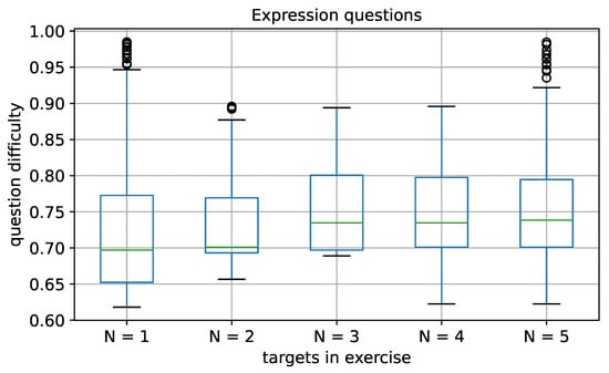 Probabilistic models like Bayesian Knowledge Tracing (BKT) are often used to estimate the students’ mastery and choose the next learning problem in exercises. It considers the probabilities of learning (transitioning to the mastery state), guessing (answering correctly without knowledge), and slipping (answering incorrectly while knowing) depending on the skill [,]. This theoretically can be used in large generated question banks because students receive different questions but learn the same skills; however, it is impossible to use it in learning-problem banks because one learning problem often requires several skills to solve. Attempts to improve the original BKT model include individualization (i.e., modeling the rate of learning or initial knowledge of each student) [,] and item difficulty (i.e., the difficulty of a particular learning problem) [,]. While they improve the performance of the original model, they also require significantly more data to train. Pardos et al. found that the model that takes into account item difficulty (KT-IDEM) showed better results over the original BKT model only when the number of solving data per problem exceeded six. This will not work for large, automatically generated problem banks aimed at providing unique learning problems for each student. Deep Knowledge Tracing, a development of Bayesian Knowledge Tracing using Recurrent Neural Networks, also relies on data from previous attempts of existing questions to teach the neural network [].