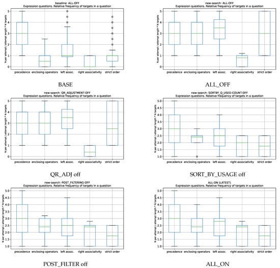 In real-world tutoring situations, concepts and especially rules that are shown in the tutor’s interface and assigned to the target, denied, and allowed categories must not match exactly the concepts and especially the rules that are stored in question metadata. For example, when teaching the order of evaluation of programming-language expressions, the situations of taking into account the precedence of the operator to the left and the precedence of the operator to the right are different rules in the formal model, but nobody teaches them separately—for teachers and students, they are represented as one rule. Similarly, in many expression-related educational situations, it is not necessary to discern arithmetic operators because they are governed by the same rules and are taught together. Sometimes, human problems of perception and understanding affect the formal model, e.g., while handling two operators with right associativity in a row can be modeled as one rule, for the human perception, it is different for unary (e.g., ) and binary () operators and should be taught and verified separately because visually, these situations are too different.