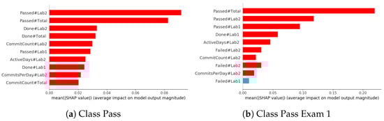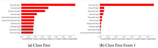 Since most of the previous findings pointed out that the first labs were the most significant and the results had shown that the prediction quality was good already after the second lab, we chose to analyze the impact of the features at this time point as well (Figure 4a). The most significant features are related to the commit quality: the higher the number of passed tests (especially in the first lab), the higher the likelihood of passing the exam. The feature types Submitted labs, Commit frequency, and Commit count still have a positive impact on the prediction.