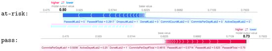 Force plot after lab 2 for two representative students, at-risk and pass, respectively. GNB classifier.