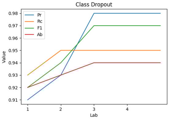 Lab dropout indicates whether a student stops attending the laboratory (Dropout N indicates that the student stopped attending the course after the N-th laboratory). It is an indicator of students’ engagement level and, in particular, it is related to both persistence and completion. Notice that stopping lab attendance does not necessarily imply course dropout [].