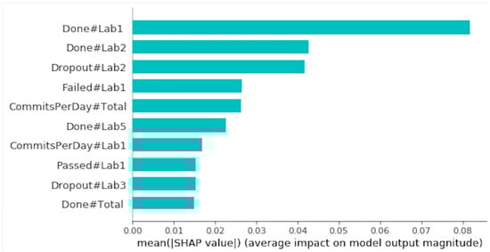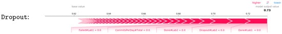 Figure 7 reports the visual explanations associated with the aforesaid ML models. The main VCS-based features turned out to be negatively correlated with the classifier outcomes. A dropout at labs 2 and 3 (Dropout#Lab2, Dropout#Lab3) negatively affected the prediction. The student has completed at least one lab and it is a sufficient condition to not be marked as Dropout student in this case study. We can conclude that a student is primarily marked as a dropout when either she/he has not attended any laboratory or she/he attended only the first laboratory with little effort. Figure 8 shows an example of a student classified as Dropout because she/he did not attend the first two laboratories.