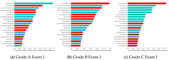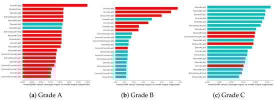 Figure 9 shows the visual explanations related to the Grade class. Grade explanations are quite diversified. Class Grade A consists of highly engaged students in terms not only of attendance (e.g., of laboratory 3) but also of notified errors (e.g., in laboratory 4). In fact, learning by doing (i.e., trial and error) is known to be beneficial for beginner programmers.