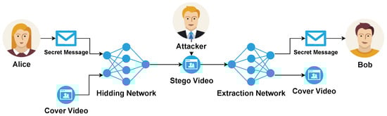 Figure 1, we can see the encrypted message, which could be text, audio, or even another video from Alice then this message is steganographed using a cover video. This video is now sent to Bob, but the attacker is performing an attack in the network and intercepting the message, in this scenario, the attacker doesn’t even know that the video has an encrypted message, and even the steganography method used to get the message. Finally, Bob can decode the message using the same steganography method and the secret key.