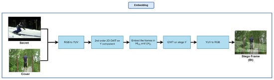 Figure 2, we create the stego frame (Bt) by converting the secret and cover to YUV, then a second-order extraction of all subbands to select the secret’s most valuable features, after this, we embed the frames in Low-High (LH) and High-Low (HL), and at the end we perform the DWT on Y and convert the frame back to RGB.
