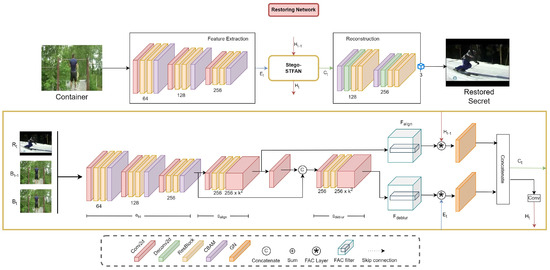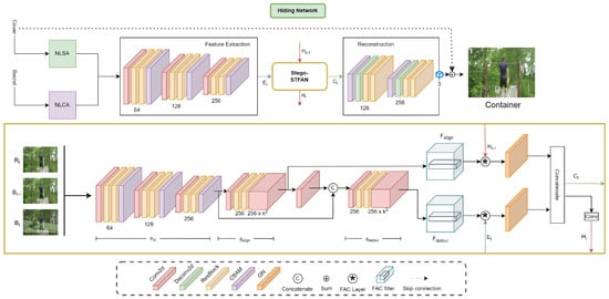 The general architecture of Stego-STFAN consists of hlthree main parts, which are, respectively, responsible for embedding, hiding, and restoring the frames.