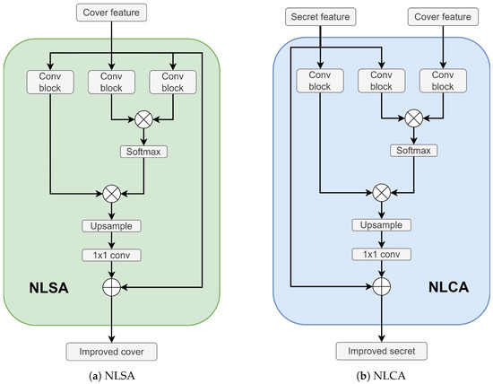 In this part of the Network, NLSA, and NLCA go into the extraction features block, which is responsible for learning the proper way to hide the secret inside the cover. The attention mechanism, given by the Non-local technique, yields a map that improves the learning of hard features like edges, fast-moving pixels (Latent Frame frames), and contextual characteristics of the frames. The second part of the hiding block focuses on building the adaptative filters, which improve the correlation between the spatial and temporal aspects of the frames and adjust the fine details according to the secret frame. In this part, there are 3 inputs: , , and . Last, the reconstruction part of the Network derives from the convolution (through FAC layers) between the previous two parts of the hiding block.