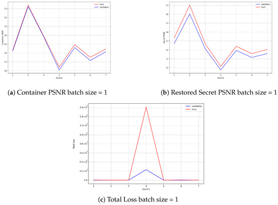 Figure 7a–c show the learning curve using the loss (MSE) and PSNR. The results using batch size = 1 are unstable due to its high stochasticity in the parameter’s update, which generates big variations from one epoch to the other. This results in loss convergence since it is harder to achieve generalization. This is present in the figures by checking loss values through the epochs, especially the total loss, which came from hundreds to millions in a single epoch. However, a good point is the similarity in performance in training and validation, which suggests that from the few features it was able to learn, it was done concisely (without overfitting). The first graph shows the Learning Curve, which did not stabilize and was briefly diverging. Also, the model struggles to maintain a consistent convergence even after the peak. The second shows the PSNR of the Container. Although they are close in quality, no statement can be made regarding the quality of the hiding due to the lack of a satisfactorily restored secret. Furthermore, the continuous variation in PSNR suggests insufficient features were incorporated to generalize. The last graph presents the PSNR curve of the Restored Secret. Validation and training performance are behaving in the same way (varying heavily), showing that no stable convergence was achieved.