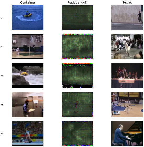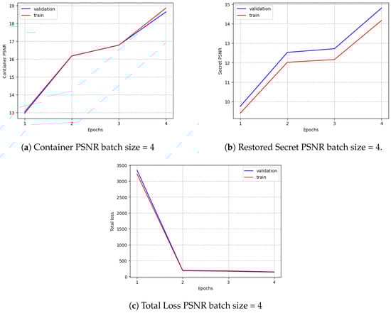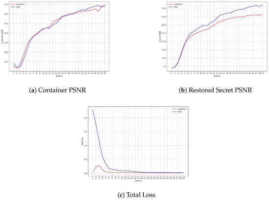 Figure 10. It is clear that the model indeed learned to steganograph. The learning curves increased as expected, deserving special attention to the PSNR of the Container, where Training and Validation frames were in almost all epochs together, suggesting that the model centered the learning on hiding. Also, this is confirmed by the PSNR absolute value. In the Validation dataset, the Container reached 27.03 dB, whereas the Restored Secret reached 23.09 dB, causing a huge gap between both tasks. However, since during and after finishing the training, the PSNR between the Container and Restored Secret is small (1.37 dB), the loss proposed indeed correctly penalized big differences between them both. Moreover, since the plateau was not reached in Container’s loss, some improvements may still be done without losing performance in the restoration phase.