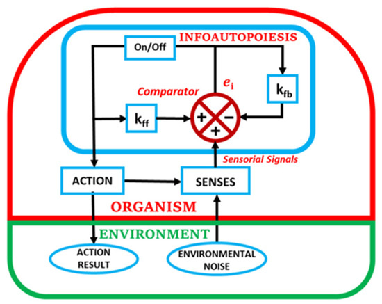 However, the notion of disregarding biological aspects of human intelligence by AI researchers is worth revisiting. The advent of neural networks is certainly an attempt at considering the perceived biological aspects of human intelligence [3]. Also, recent papers by Yann LeCun [4,5] show instances of considering biological aspects of human intelligence as relevant to defining the architecture germane to AGI. Figure 1 shows the perceived interconnected modular structure of an autonomous AI on which developments toward AGI are based [4]. To invite a comparison, Figure 2 depicts the human organism in its environment used to pose the process of info-autopoiesis [2]. No attempt is made here to describe the workings of these figures in detail. For that the reader is referred to the cited references. Both figures convey the same general relationship that exists between a human actor (organism) and its environment. The main ultimate difference between these two ways of looking at the problem is that LeCun can devise some very creative ways, still in the process of development, to solve the problem of AI that he poses. LeCun believes that it is a matter of time (10 years) before AGI is achieved using “world modeling” [6]. On the other hand, Cárdenas-García [2], using the info-autopoiesis framework, deems that the problem defined as AGI is not achievable, no matter the effort, arguing that this non-achievable realization should lead to the development of some very interesting applications in AI while pursuing goals that are more in line with this awareness, limiting the resources used in the pursuit of ambitious unachievable AGI projects.
