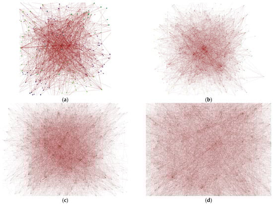 Figure 1 shows 2D visualization using the Fruchterman–Reingold algorithm with different numbers of vertices and respective edges. As seen, the edges gradually overlap the vertices, which causes the loss of the original information about groups of vertices, as can be seen, for example, in the visualization of a graph with the number of vertices of 500.