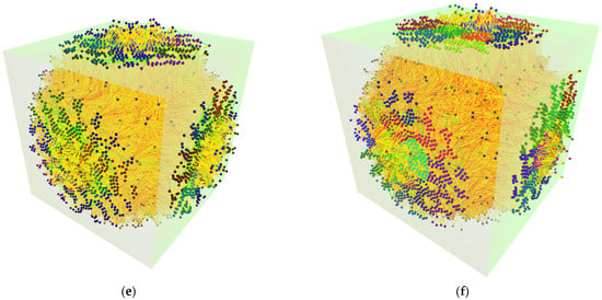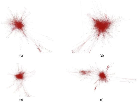 Results of modified Fruchterman–Reingold algorithm for 3D implementation rendered as the default view with no additional user interaction in 3D: (a) Pokec 500 containing 500 vertices and 3084 edges; (b) Pokec 1000 containing 1000 vertices and 6297 edges; (c) Pokec 2000 containing 2000 vertices and 18,313 edges; (d) Pokec 3000 containing 3000 vertices and 29,177 edges; (e) Pokec 4000 containing 4000 vertices and 41,363 edges; (f) Pokec 5000 containing 5000 vertices and 52,182 edges.